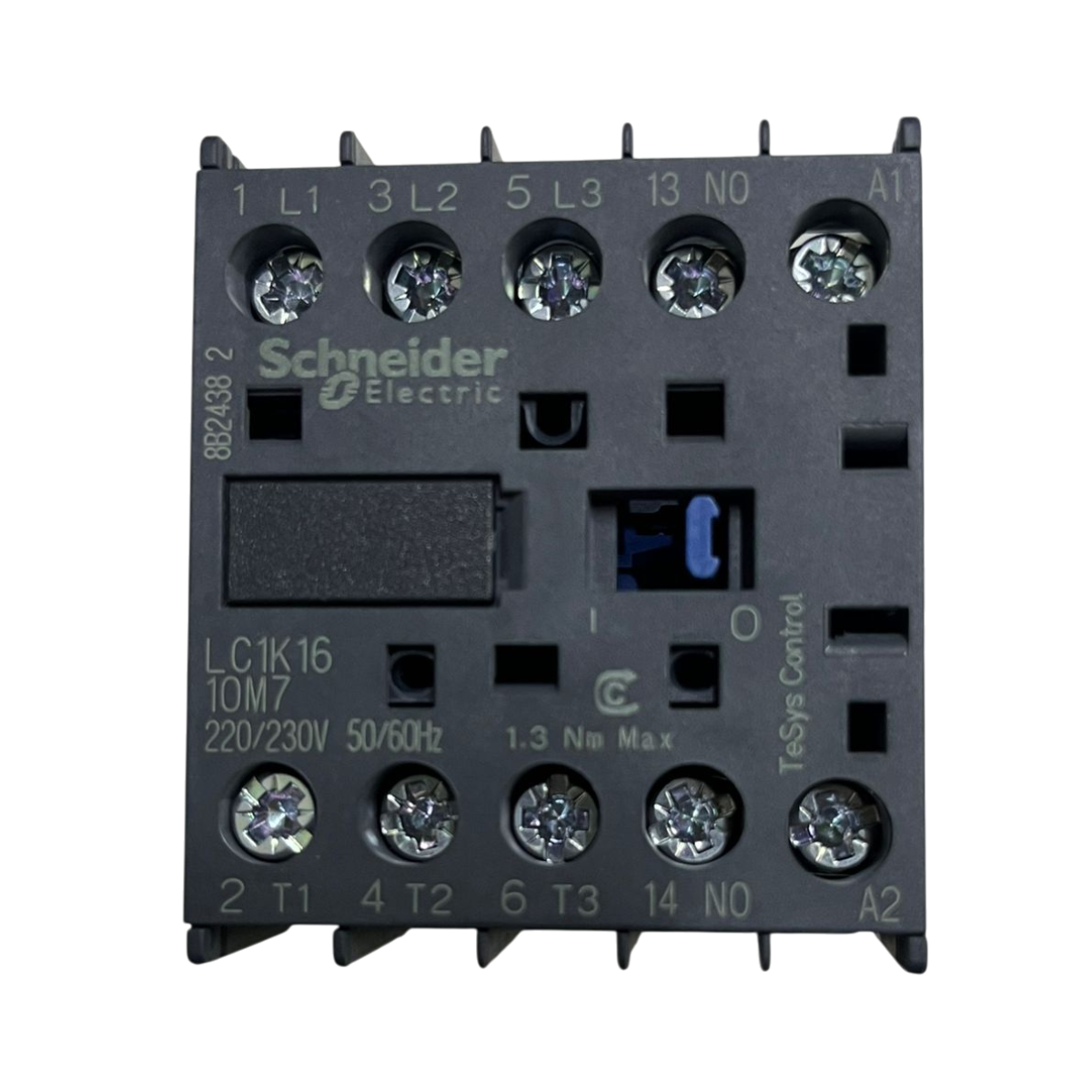 Contator tripolar Schneider da linha TeSys K, modelo LC1K1610M7, com capacidade de 16A, equipado com 1 contato auxiliar normalmente aberto (NA) e bobina de comando para 220V AC.
